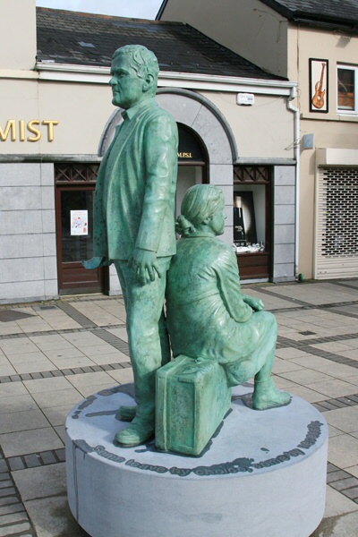 Always Come Home Title: Always Come HomeMaterial: Bronze on limestoneScale: 8feet 240cmLocation: Centenary Square LongfordArtist: Rory BreslinDescription: Standing male looking East seated female looking West each holding a ticket for a Cunard