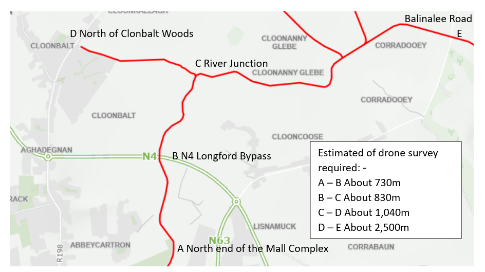 As a result, Longford County Council has secured the services of an external contractor who will carry out a drone survey on Thursday, 20 March. This will cover sections of the Camlin River, north of Longford Town as noted in the map below